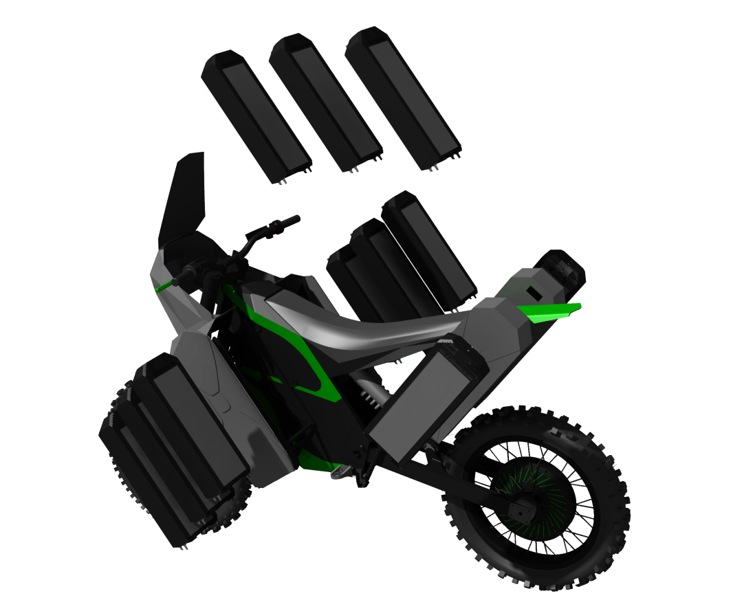 1 - 3 battery modules inside the bike without expansion kits for 40 - 125 km of range from 1.7 - 5.2 kWh.