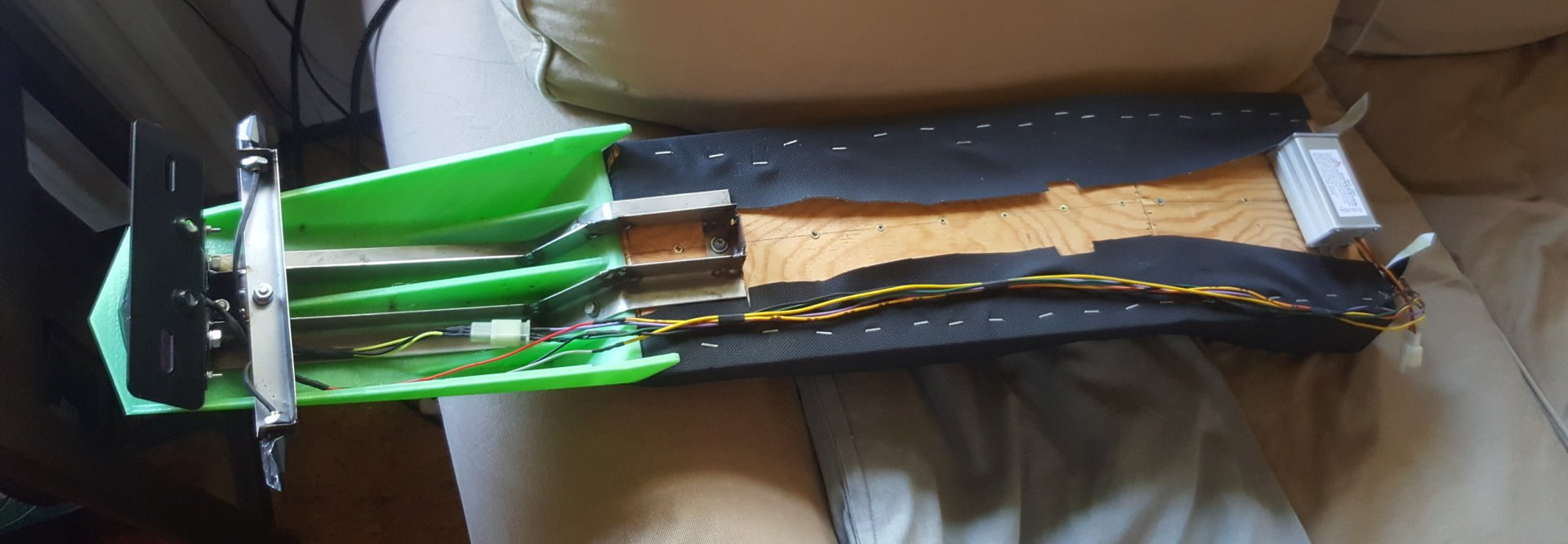 Auf die weitestgehende Fertigstellung der Metallarbeiten konnte die Arbeit an der Elektrik und dem 12V Kabelbaum folgen. Zunächst wurde hier die Heckbeleuchtung mitsamt Kabelbaum an einem hierfür gebauten Träger befestigt, der gleichzeitig dem Fender zusätzliche Stabilität verleiht. Der zugehörige 72V - 12V Spannungswandler fand unter dem Vorderteil der Sitzbank platz.